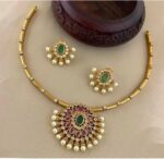 Add a touch of royal elegance to your ethnic look with this beautifully crafted necklace set, featuring a stunning round pendant adorned with emerald green stones, purple enamel work, and premium pearl hangings. The matching earrings complete the set, offering a timeless traditional charm suitable for all festive and wedding occasions.